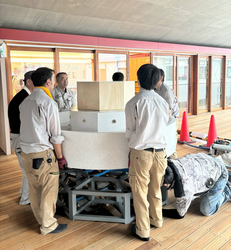 スペック/本体+シンク一体型人工大理石 直径1,400ミリ 6名掛かりで架台まで移動し設置。