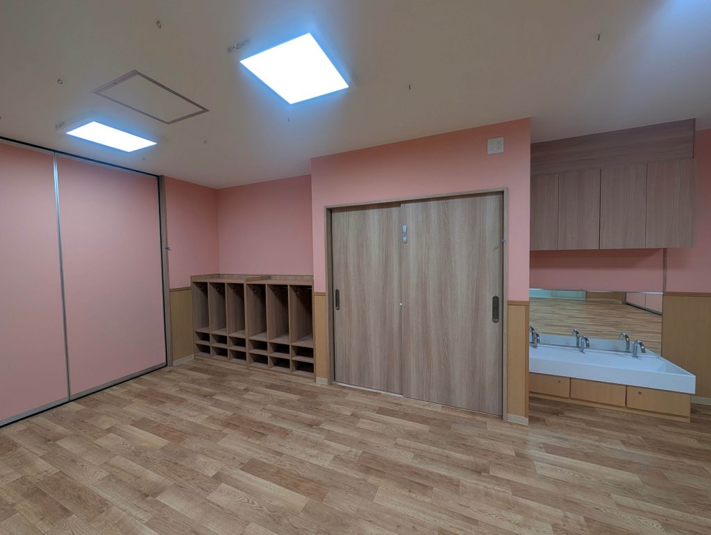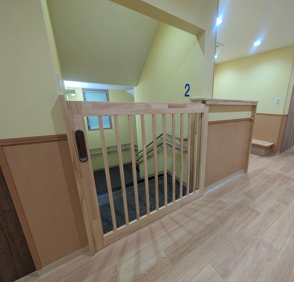 園児たちにとって危険な階段前を格子戸で仕切る 大型の引手が際立ちます。