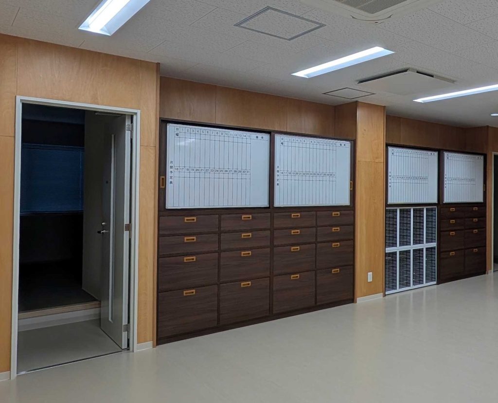 壁面収納の家具引違扉にホワイトボードをはめ込んで設置