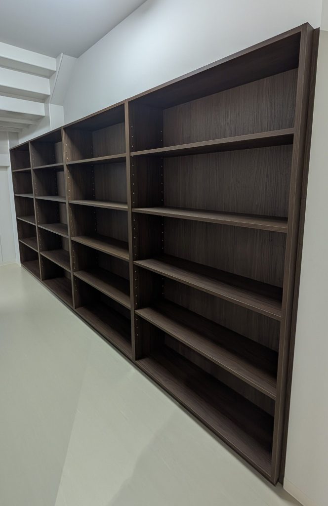 総幅約4.5mの壁面収納 棚板は可動棚式です。