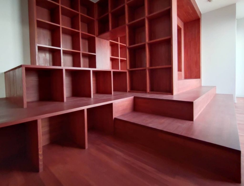 階段状に本棚を積み木の様に組み合わせた